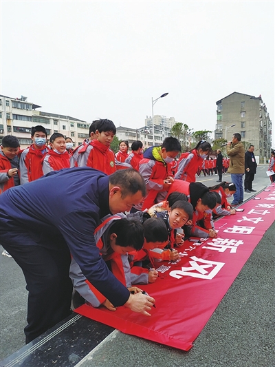 在校长黄定成带领下,全体师生代表在“弘扬雷锋精神,树立文明新风”横幅上签名,一笔一画都写出了同学们立志时时学雷锋,刻刻做雷锋的决心!