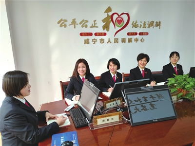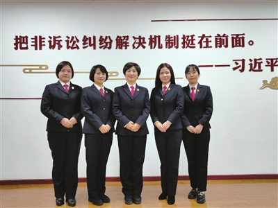 在咸宁市中级人民法院派驻市人民调解中心法官工作室,有这样一支由5名女法官组成的“娘子军”。她们以自己的辛勤汗水和智慧,践行“公正司法,一心为民”的价值追求,她们以满腔的工作热情、踏实的司法作风、睿智的专业技能架起了人民法院与群众的“连心桥”,她们在平凡的工作岗位上做出不平凡的业绩,用汗水和智慧证明“巾帼不让须眉”。自2019年11月入驻至今,法官工作室受理案件300余件,审结案件297件,参与或指导调解工作140余件,调解能力和办案质量受到调解员和当事人的一致好评。她们成为人民调解中心一道靓丽的风景线。