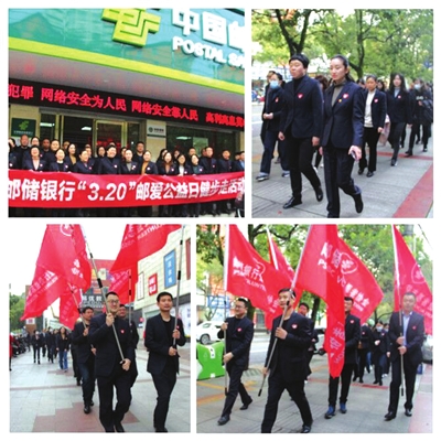 当天,邮储银行咸宁市分行员工统一佩戴“邮爱公益”logo胸贴,拉 横幅、举红旗,以健步走的形式,沿着人口比较密集的温泉中百、茶花路、桂花北路沿途发 放宣传折页等,向过往行人宣传介绍“邮爱公益基金”和“邮爱自强班”等内容,将咸宁邮 储人的关爱和温暖传递给社会,并拉开了以全行员工为单位的员工网上捐赠行动序幕,为全 国“邮爱自强班”再献爱心。