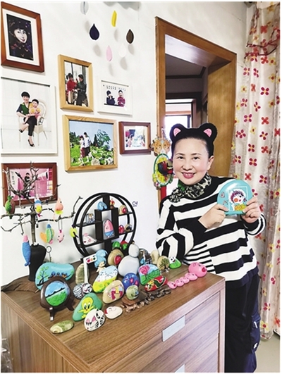 记者看到,在杨阿姨的家中,摆满了各式各样的石头画,将屋里装点得色彩斑斓、童趣十足。杨阿姨说:“这些年来,我画了千多块石头画吧。”