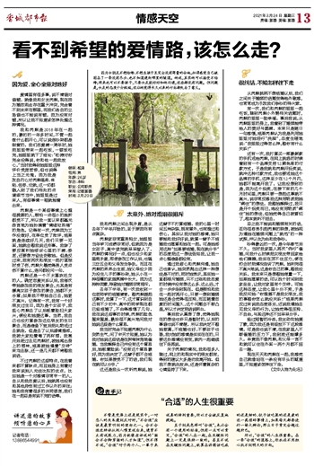 总之我不能说和婚姻有关的话,否则很容易引起芮琳的联想,被她视为逼她在婚姻问题上“就范”的一种试探,并以此为由和我争吵。