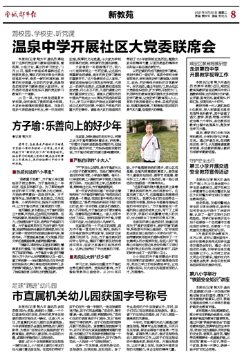 爱学习、自我要求严格的方子瑜是市实验小学四年级的一名学生,近日获得咸宁市“新时代好少年”的荣誉称号。她在学习的跑道上坚持不懈;在生活的舞台上乐观向上,用行动诠释心中好少年的标准。