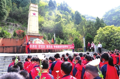 3月29日上午,通城县隽水小学师生在黄袍革命烈士纪念碑前向革命先烈敬献花圈。