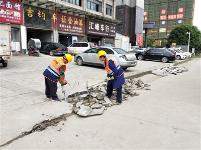 本报讯(记者周阳 通讯员陈以红 王晓明)4月19日,在市区双峰路,因一些门店店主擅自设置连续大面积接坡,车辆随意停放到人行道上,不仅影响市民出行,而且造成人行道地砖破损、下沉,市城管执法委市政管理处巡查发现后,组织人员进行拆除。