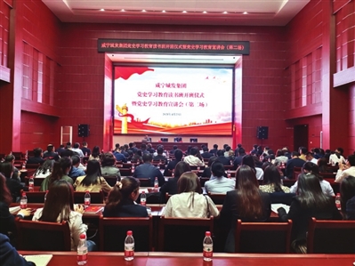 本报讯 (通讯员 梅楚 ?汪婷) 4月23日,咸宁城发集团党史学习教育读书班开班仪式暨党史学习教育宣讲会(第二场),在传媒大厦201报告厅举办。市党史学习教育宣讲团成员、市委党校校委委员、副教授解全胜同志作党史专题宣讲,城发集团党委副书记徐峰同志主持开班仪式并作讲话,城发集团全体党员、入党积极分子共计200余人参加学习。