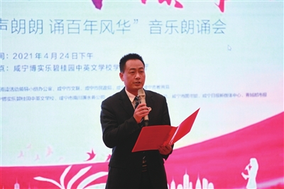 在“4·23”世界读书日来临之际,由市全民阅读活动领导小组办公室、市文联、市民政局、市妇联、市教育局主办,咸宁市朗诵艺术家协会、咸宁碧桂园房地产开发有限公司、咸宁博实乐碧桂园中英文学校、咸宁市南川源水务公司承办的“书声朗朗·诵百年风华”音乐朗诵会在咸宁博实乐碧桂园中英文学校燃情上演。
