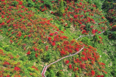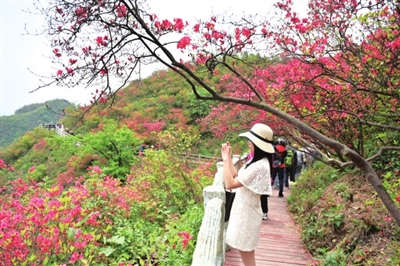 “千姿百态色斑谰,千山万岭总相见。子规啼血化丽姝,花中西施数杜鹃。”近日,通山县大幕山林场海拔700米的山坡上,连绵1000多亩的野生杜鹃美丽盛放,漫山红遍、层林尽染,美丽的花海吸引了众多游客前往打卡拍照。 (记者 陈诗傲 赵忠志 毛亚轩 张仰强)