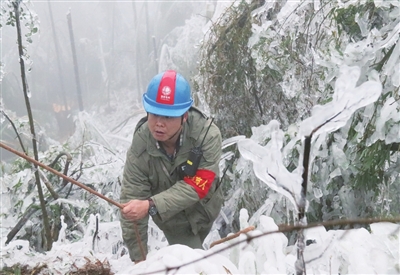 2008年特大雪灾,地处通山界水岭山上的220千伏塘吴线,零下10℃,四五十厘米的厚雪,行走异常艰难。上午八点进山,下午五点下山,一手拿着登山杖,一手握着望远镜,如发现线上覆冰严重便尽快登记汇报,每天不仅摔跤无数,且只能吃饼干充饥。“有一天发现一基塔倾斜严重,第二天便与8个同事去给塔身临时拉线加固。”李凡介绍,行走都难,还要在雪林中拉线,更要上杆作业,平时一两小时的工作量,当天用了六小时。2019年寒冬暴雪,九宫山110千伏九石线21号杆导线断线,杆塔随时都有倒杆的危险。接到紧急抢修任务,李凡和同事立即驱车赶往现场,饿了就和着积雪随便吃上几块饼干,连续抢修三天,终于为村民恢复了供电。