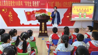 该园通过红色文化教育弘扬社会主义核心价值观和爱国主义精神,引导幼儿追红色记忆、寻红色足迹、承红色精神,将党史学习教育,从娃娃抓起。让孩子们从小接受革命传统教育,感受红色文化魅力,让红色种子在幼小的心灵萌芽。以“八红润童心”红色主题教育活动来展开:红色故事我来讲、红色歌曲我传唱、红色好事我去做、红色游戏我在玩、红色电影我观看、红色书画我参赛、红色剧目我演艺、红色精神我传承等。让孩子们在红色教育中潜移默化地传承先辈们不怕牺牲、顽强拼搏的革命精神,让红色基因渗透到孩子们的生命中、血液里,让红色经典代代相传。