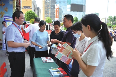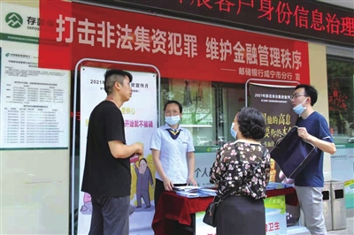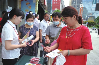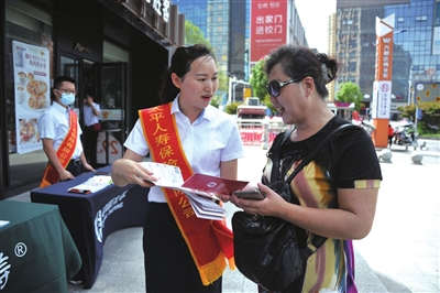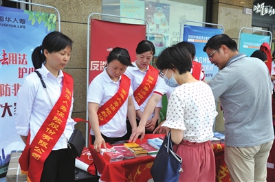 “您好,这是《防范和处置非法集资条例》,免费送您带回家给家人了解非法集资的危害。”6月15日上午,太平人寿咸宁中支宣传员邓静娟正在万顺达门口为过路市民发放宣传单。当日为集中宣传日,万顺达门口有6家保险公司“组团”宣传。咸宁银保监分局联合市银行业协会、市保险行业协会深入市内部分银行保险机构网点,实地督导防范非法集资宣传工作。