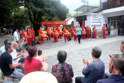 威风锣鼓、黄梅戏独唱、群舞、葫芦丝独奏、大合唱……演出团队深情演绎,在回顾党的光辉历程、讴歌党的丰功伟绩的同时,给当地群众带来了一场视听盛宴。
