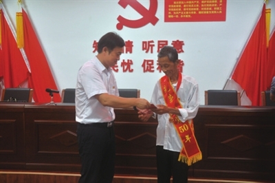 在支部主题党日活动中,市科技局党组书记、局长熊武华带领全体党员干部重温入党誓词,为印山村5组73岁的老党员尹佣学颁发“光荣在党50年”纪念章,并致以诚挚的祝福。