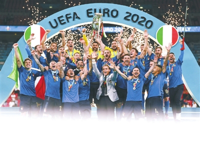 本报综合消息 北京时间昨日凌晨,队长基耶利尼抱着刚刚刻上“意大利”名字的德劳内杯,微笑着走向颁奖台,在那里全队的教练、队友、工作人员们早就迫不及待,基耶利尼在他们的簇拥之下,双手高举奖杯,舞台上的彩带一起飞舞——时隔53年之后,意大利队再次站上“欧洲之巅”!