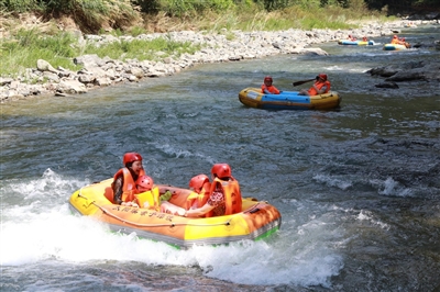 7月15日,游客在通山县厦铺镇冷水坪村风铃谷野奢帐篷营地景区体验水上漂流项目。