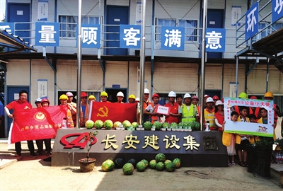7月15日,咸安区浮山街道碧桂园社区联合碧桂园鄂东地区党支部开展“送清凉”慰问活动。活动中,浮山乡贤志愿服务队碧桂园社区公益小天使分队的志愿者们为高温中奋战的建筑工人送上西瓜、矿泉水、藿香正气水等防暑降温物资,向他们表示慰问。(记者王奇峰通讯员刘娜万娟)