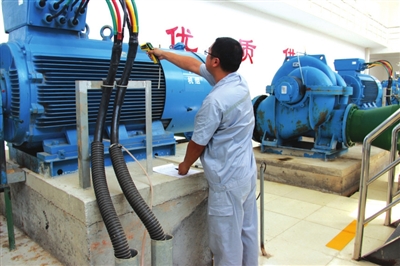 夏季是用水高峰期,为保障城区供水无碍,水厂的泵站早已进入超负荷运转模式。确保供水机组正常运转是夏季保供水工作中最关键的环节,因此每隔两小时就需对供水机组设备进行巡视检查,全天24小时无休。走进泵站,感觉仿佛置身于蒸拿房一般。虽然在室内,但由于机组大设备散发出的庞大热量,即使有排风扇等设施散温,但泵站内的温度仍然比室外高出一截。此时,陈锋正在进行日常巡检工作,决然不惧泵站内的高温,仔细的巡查着每一台设备。
