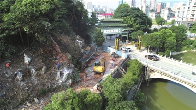 7月20上午,记者在市区温泉桥(一号桥)桥头山体看到,目前该段人行步道已封闭,施工人员正在利用专业设备对山体进行除险加固施工。据了解,该项目主要对温泉桥桥头河岸的山体斜坡进行治理,工程斜坡宽91.8米,坡高12米,治理面积1102平方米。主要在崩塌前沿设置种植槽,坡体削方整形并采用主动防护网和仿古棚洞方式进行加固。项目的实施将有效消除地质安全隐患,同时美化山体景观环境。 记者赵忠志/摄