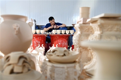 7月7日,通城县杭瑞陶瓷产业园内,楚窑研发人员在生产瓷器工艺品。