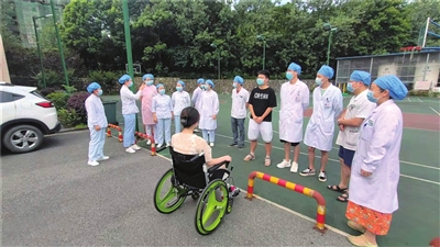 当日上午8点30分,演练正式开始。值班护士巡房时,发现10号病房浓烟四起出现火情,立即启动“科室消防应急预案”:迅速跑去按下附近的手动报警按钮,一边大声呼叫着火,一边拿起灭火器进行扑救。听到呼喊的科主任朱俊迅速跑向着火点查看,发现情况不妙,火势已经蔓延,失去控制,以科室力量无法将火扑灭,立即组织医务人员及患者向外疏散。对行动不便、危重病人,用轮椅、担架、可移动病床向室外安全区域进行疏散转移。