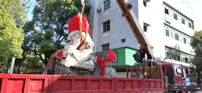 本报讯(记者周阳 通讯员王强)7月29日,在温泉城区淦河大道,市城管执法委综合执法四大队请来吊车,对一座占道石狮子进行拆除,还道于民。