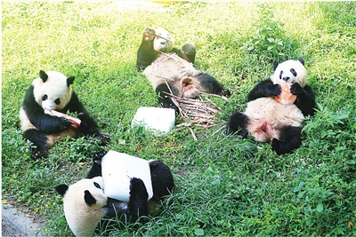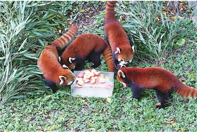 住的舒适了,吃的也要凉爽。为了给大熊猫们降温,动物园同样用水果、蔬菜制作了超大的“冰淇淋”,四只大熊猫宝宝双双、重重、喜喜、庆庆争相抱起“冰淇淋”左舔舔、右尝尝,吃得不亦乐乎。这种水果“冰淇淋”每块重二三十斤,够大熊猫们吃上好一阵子。
