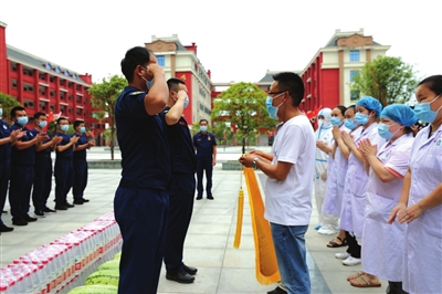 当日,全体消防员为奋斗在一线的白衣天使送上慰问品,并将一面印有“不忘初心担使命,众志成城抗疫情”的锦旗,送到医护人员手中,感谢他们在疫情防控第一线的执着坚守和无私奉献,为社会筑起守卫生命防线。
