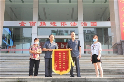7月下旬的一天,崇阳县铜钟乡村民吴婆婆带着儿媳赵某来到崇阳县人民法院,将一面上书“执法为民一身正气,勤政为民两袖清风”的锦旗送到该院执行干警手中,表达对执行干警的谢意。