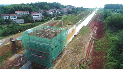 8月26日,记者在“两湖连通”工程施工现场看到,目前工程的进水渠、出水渠、箱涵已全部完工,正在进行最后的节制闸主体施工。