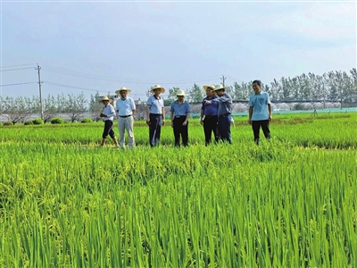 日前,市农业科学院向阳湖试验基地内,一片绿油油的水稻在阳光下反射出莹润的光泽。偶有清风徐来,稻香扑鼻,驱走些许暑热。稻田旁,市农科院粮油所的几名工作人员顶着烈日行走田间,正在进行观察记载。