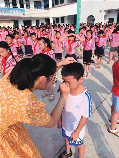 朱砂启智,寄予了美好的寓意和期盼。一年级老师给一年级新学子的额头正中点上红痣,老师们用朱砂点智以此寄托美好的愿望,希望孩子们从此开启美好的小学生活,眼明心亮,好读书,读好书。