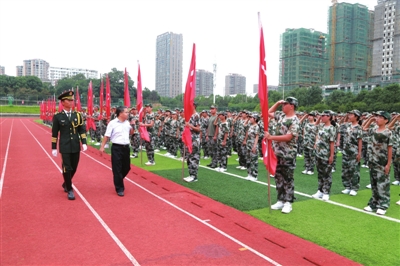 结营仪式在雄壮的国歌声中开始,校长袁慎彬对参训学生进行了检阅,并对老师和同学们的辛苦付出表示了慰问。二十三个方队迈着坚定的步伐,喊着嘹亮的口号依次接受检阅,个个精神抖擞,意气风发。各连队在会操中展示了跑操、男生拳术表演、女生匕首操表演、花样方队、手语操、集体停止间等动作。黝黑的皮肤、整齐的步伐和坚定的眼神,是他们最好的答卷。随后,学校对军训表现突出的钢铁战士、优秀学员、优秀指导员、优秀连队给予表彰。