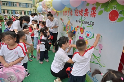 本报讯(记者杜培清 赵忠志 通讯员余璐 曹宏亚)9月6日,市交通实验幼儿园开学仪式上,幼儿们在“载梦百年,绽放未来”心愿墙上贴上自己的理想,医生、消防员、解放军、科学家成了他们的崇拜偶像。