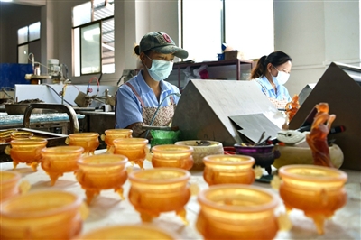 9月17日,通城县铁柱工业园内,万韵琉璃文化有限公司员工在生产加工、包装琉璃工艺品。