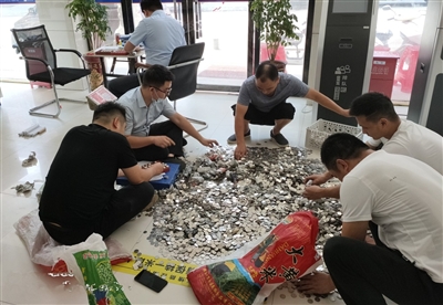 该行迅速安排全员分工,大堂经理和保安一起把客户的硬币搬进营业厅,随即,银行员工在大厅开始拆除清点、整理、捆扎,经过前后6天的忙碌,10万元硬币最终清算清楚,并成功帮肖先生办理了入账手续。