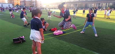“来,我教你们。”在跑道一侧的橡皮筋区域,403班的蒋依心,双脚跳进跳出,边跳边与同学交流跳皮筋的心得。虽然每天玩的时间不长,但自由选择的区域活动,很受同学们欢迎。