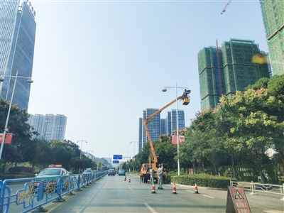 9月28日,记者在城区银泉大道看到,数名路灯检修员操作工程车,对道路两旁的路灯进行检修,保障城市道路亮化,迎接国庆佳节。