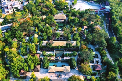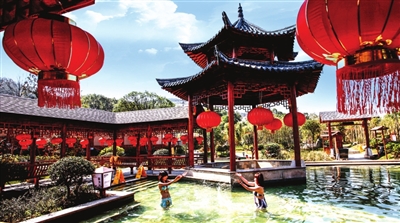 70个形状各异的温泉泡池依地势而建,原汤泡池或置于绿树下,或置于竹枝旁,或泉水依山石而下,或从池底喷薄而出……独特的自然环境让温泉浑然与天地相连,亭台楼阁,黄墙黛瓦,就像是闯进了古时江南的大户人家里,似乎一不小心就会邂逅在此吟诗作画的文人。