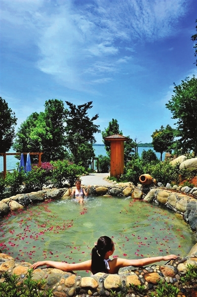 山湖温泉度假区位于牛头山南麓、白湖北岸,半面环湖,风景甚好。沐浴在温泉里,湖光山色也可尽收眼底,给人“身在温泉、心在大海的”心灵享受。