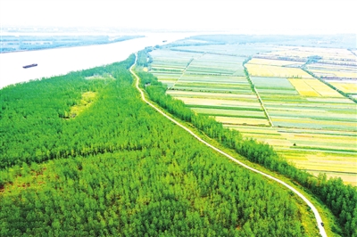 10月13日,嘉鱼县簰洲湾镇长江大堤两边的防浪林郁郁葱葱。我市拥有128公里长江岸线。2018年至2020年,全市累计完成长江沿岸造林绿化11.44万亩,占省定任务10.84万亩的105.54%,超额完成造林任务。 陈勇摄(影像咸宁)