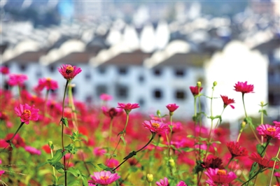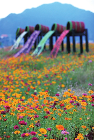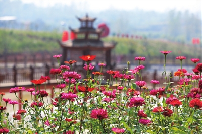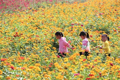 王明璠花海总面积近500亩,景区以打造集生态旅游、民宿度假、儿童游乐、文化旅游、婚纱摄影、户外运动等为一体的七色花海田园综合体。暖阳里,前来观光休闲的游人络绎不绝。轻风吹来,一阵香气扑鼻,美丽的百日菊竞相开放,花香四溢。漫步花海中,层层花浪让人都成了画中人。