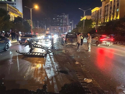 路面监控视频显示,11月2日晚9点21分,城区长安大道咸安体育中心附近路段,一辆越野车突然撞上护栏,导致该车和多截护栏受损,对向车道一辆正常行驶的小车也受到牵连,事故造成该路段开始拥堵。