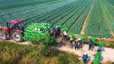 11月3日,在嘉鱼县潘家湾镇畈湖村,经纪人游还原正在组织菜农装运包菜,她与全村菜农签订了包销3000多亩销售合同,今年秋季蔬菜长势好、价格好。