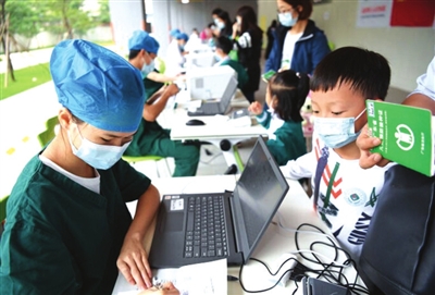 记者在现场看到,广州荔湾区人民医院的医务人员先是询问近期病史,其后查验知情同意书、流行病学史调查问卷,再扫描手机上“粤苗”应用程序、核对小朋友个人信息,然后才出具相关单据。