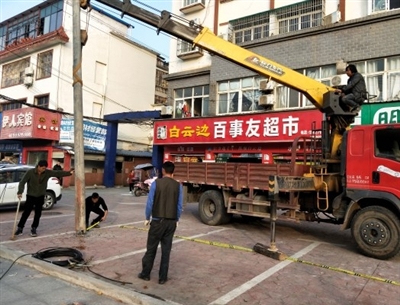 本报讯(记者周阳 通讯员赵丽红 王晓明)市区街头,电线杆及斜拉绳“霸占”停车位。11月29日,市城管执法委督办,组织通信运营商将电线杆拆除。