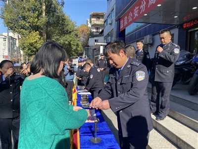 拿到失而复得的财物,失主们喜悦之情溢于言表,将7面印有“为民担当、破案神速”“贴心为民暖民心、人民警察为人民”等金色大字的锦旗送到派出所民警手中,表达他们的感激之情。