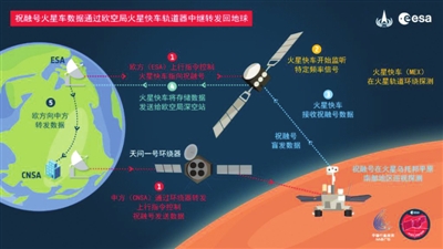 试验前,双方向各自探测器上行指令做好试验准备。在约定时刻,由祝融号向火星快车发送测试数据,通信距离约4000千米,通信时长10分钟。火星快车接收数据后转发给欧空局所属深空测控站,测控站接收后发送给欧洲空间操作中心(ESOC),ESOC再转发至北京航天飞行控制中心,由中方技术团队解译后,判读数据的正确性。
