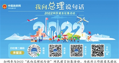 新华社电 12月20日起,中国政府网联合人民网、新华网、中国日报网、光明网等22家网络平台,以及各地区、相关部门政府网站开展2022“我向总理说句话”网民建言征集活动,听取网民对政府工作的意见建议,推动公共政策进一步完善。活动将持续到2022年全国两会期间。