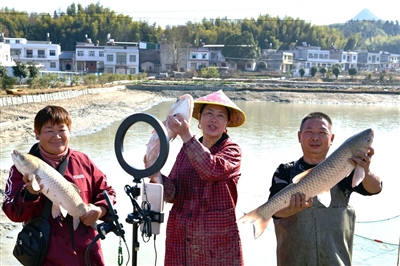 12月19日,通城县塘湖镇南虹村汤管山水产养殖示范基地的生态鱼喜获丰收,渔民协力起网捕鱼,网红网上现场直播销售,一派鱼跃人欢的丰收景象。
