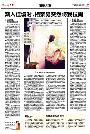 发完这条信息以后,我好半天都没等到他的回复,心里不免有点情绪。于是我又给他发了一条在网上看到的短视频,主要就是教人如何在回复信息的时候表现得积极、热情。可是他仍然没有再说话,一直到了晚上,他突然发来一句“无法相濡以沫,就此相忘于江湖”。我问他这是什么意思,却发现消息无法发送,他已经把我拉黑了。