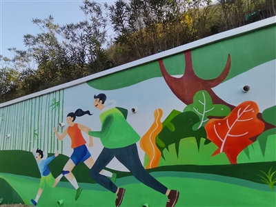 张航介绍,永安大道飞宁小区旁涂鸦墙共两列,一列以“团结互助”为主题,内容包括一起手挽着手、互相鼓励、邻里互动、把旧衣物放进回收箱等生活场景;一列以“绿色出行 健康生活”为主题,该涂鸦墙位于停车场处,画面以青年骑自行车来凸显节能环保。